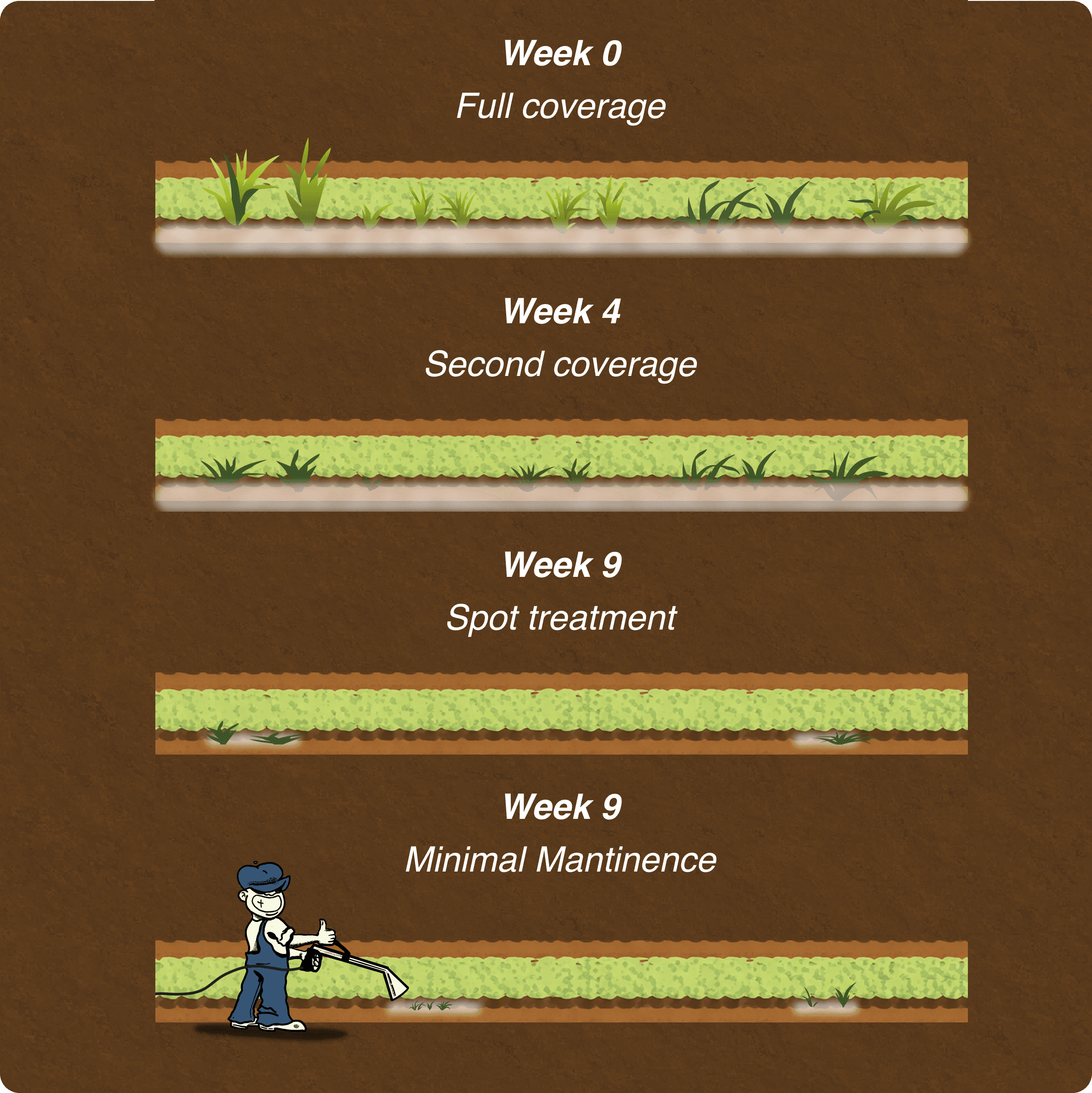 Weeds die down to the root, and surrounding seeds are sterilized — reducing long-term weed cycles.